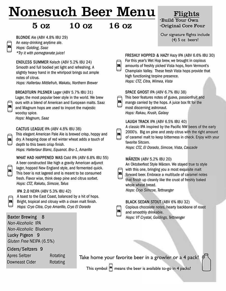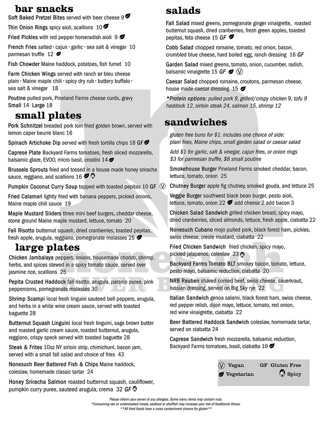 Nonesuch River Brewing strives to use local and seasonal ingredients as much as possible. Because of this, our menu changes with the seasons. Below is a sampling of some of the dishes we might have available.